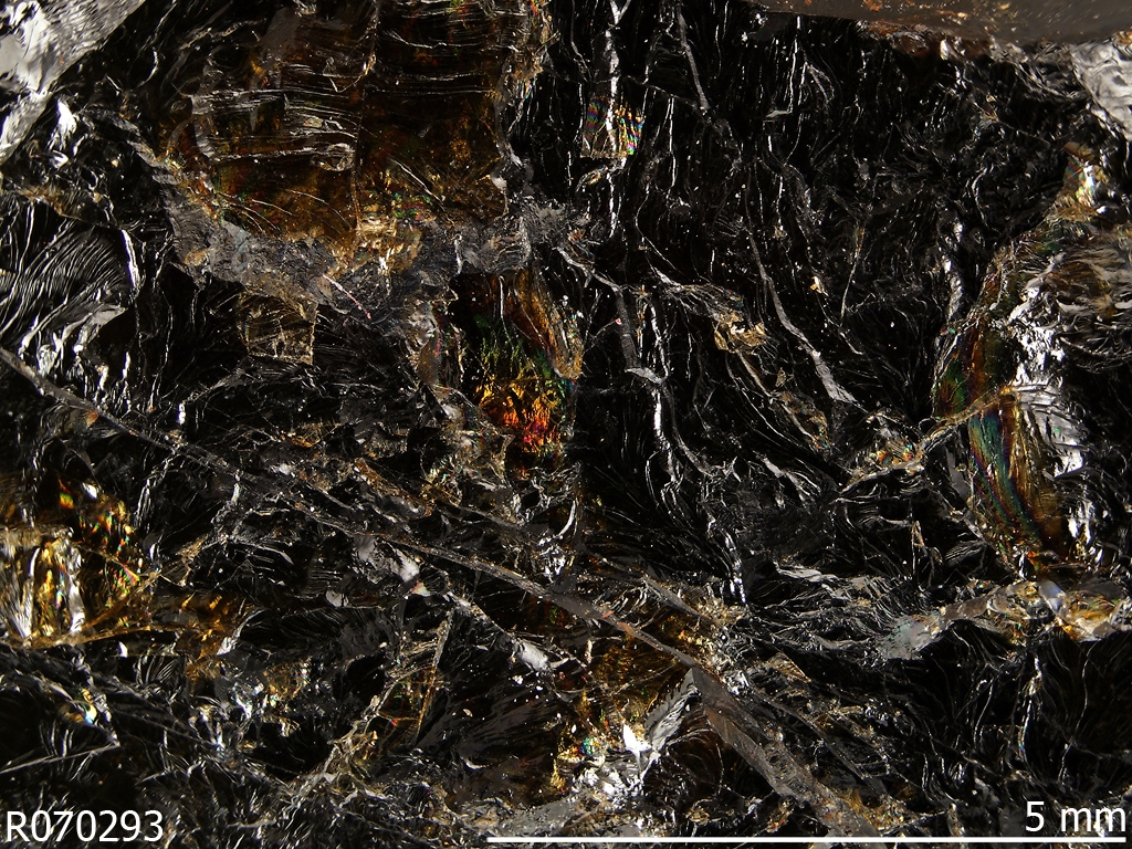 | Background information | Black single crystal fragment with internal hints of red and green. |